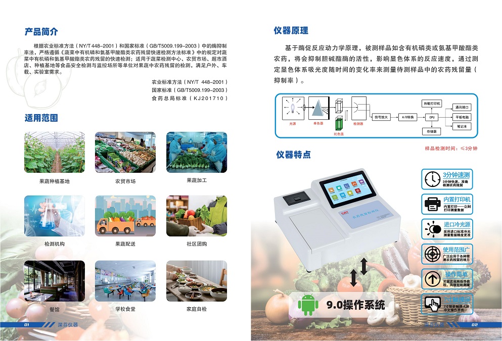 深芬儀器生產(chǎn)的安卓智能型農(nóng)藥殘留測(cè)定儀;是根據(jù)農(nóng)業(yè)標(biāo)準(zhǔn)方法(NY/T 448-2001)和國(guó)家標(biāo)準(zhǔn)(GB/T5009.199-2003)中的酶抑制率法,嚴(yán)格遵循《GB/T5009.199-2003蔬菜中有機(jī)磷和氨基甲酸酯類(lèi)農(nóng)藥殘留快速檢測(cè)方法標(biāo)準(zhǔn)》中的規(guī)定對(duì)蔬菜中有機(jī)磷和氨基甲酸酯類(lèi)農(nóng)藥殘留的快速檢測(cè)??蓮V泛應(yīng)用于各級(jí)蔬菜檢測(cè)中心、農(nóng)貿(mào)市場(chǎng)、超市、環(huán)保機(jī)構(gòu)、蔬菜種植基地、飯店、車(chē)載及實(shí)驗(yàn)室等食品安全檢測(cè)與監(jiān)控場(chǎng)所等單位對(duì)果蔬中農(nóng)藥殘留的檢測(cè)。農(nóng)藥殘留測(cè)定儀能準(zhǔn)確、快速檢測(cè)出蔬菜、水果、糧食、茶葉以及土壤中有機(jī)磷和氨基甲酸脂類(lèi)農(nóng)藥殘留的快速檢測(cè)。